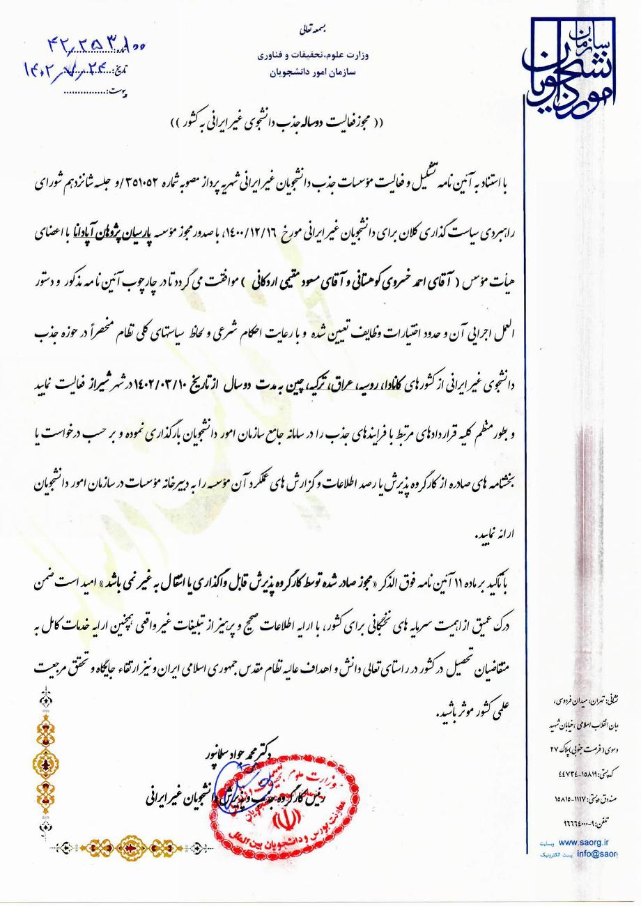 ترخيص رسمي من وزارة العلوم، البحوث والتكنولوجيا في جمهورية إيران الإسلامية