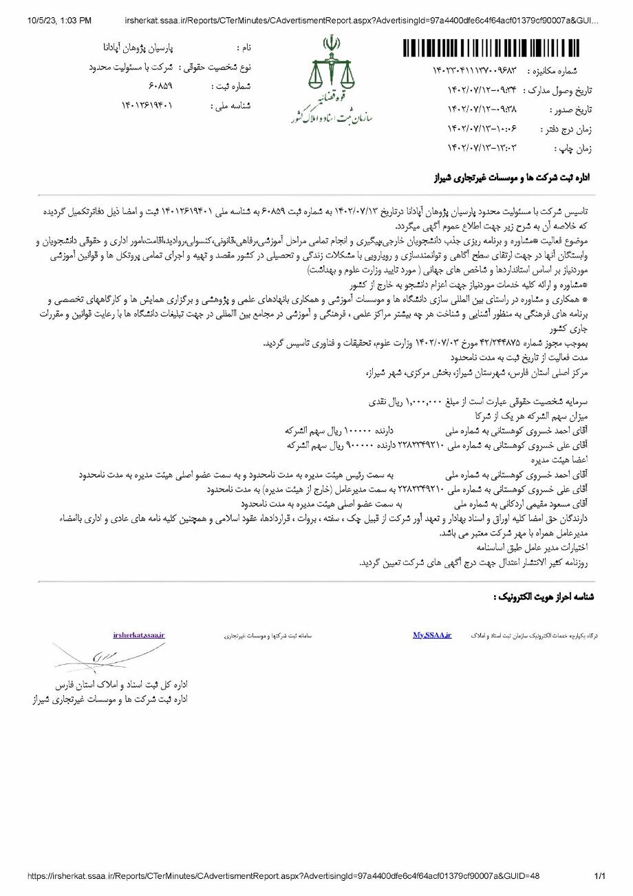 في عام 2023، تم تأسيس شركة خاصة تُدعى "بارسيان بژوهان أبادانا" التي تعرف الآن باسم "Study in Iran". هدفنا هو إحداث تأثير إيجابي في العالم من خلال هذه المنصة. بالإضافة إلى ذلك، سننفذ مشاريع خيرية تتعلق بمهمتنا وفريقنا. اليوم، يتكون فريق "Study in Iran" من أكثر من 15 شخصًا من 4 جنسيات مختلفة، ويقع مقر نشاطنا في شيراز، إيران. في الوقت الحالي، يتعاون أكثر من 375 جامعة ومؤسسة تعليمية في جميع أنحاء إيران معنا. كما أن جمعيات الطلاب الدوليين هي شركاؤنا الرئيسيين في تطوير الخدمات وإعلام الطلاب حول إمكانيات هذه البوابة.